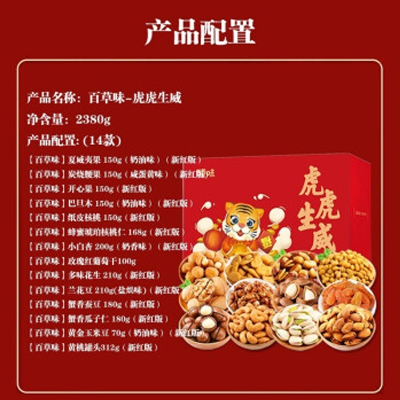 全部商品>礼包礼盒>百草味>百草味坚果礼盒虎年生肖款年货大礼包节日礼品送礼团购含开心果夏威夷果腰果坚果炒货果干 【虎虎生威2380g/14袋】